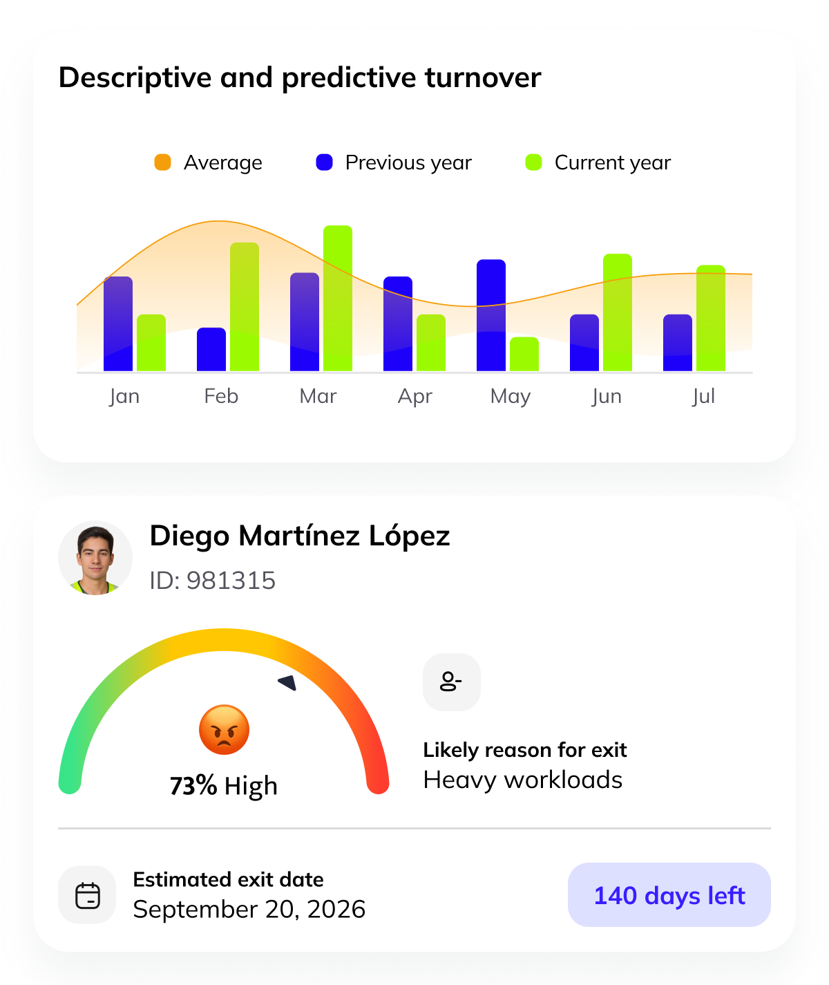Our predictive AI analyzes attendance patterns, performance and employee sentiment to anticipate turnover. It identifies who might leave, when and why, so your HR team can take action early and retain key talent.